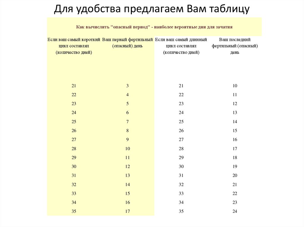 Для удобства предлагаем Вам таблицуКак вычислить "опасный период" - наиболее вероятные дни для зачатия