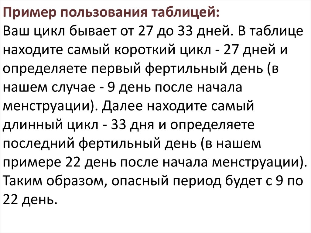 Пример пользования таблицей:Ваш цикл бывает от 27 до 33 дней. В таблице