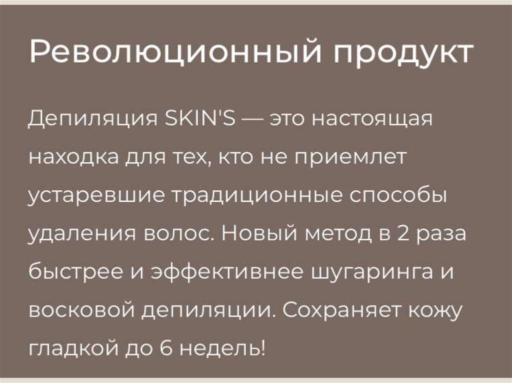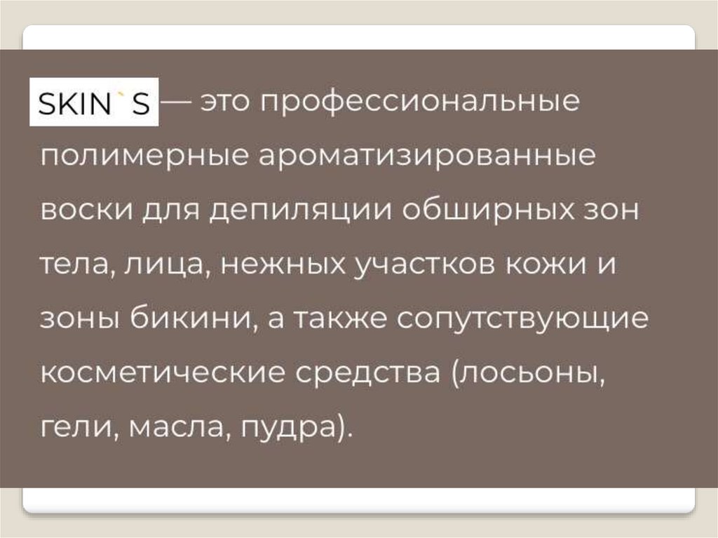 1. Skin's- это совершенно новая, уникальная система депиляции. Skin's- не сахарная паста, не традиционный и не плёночный воск.