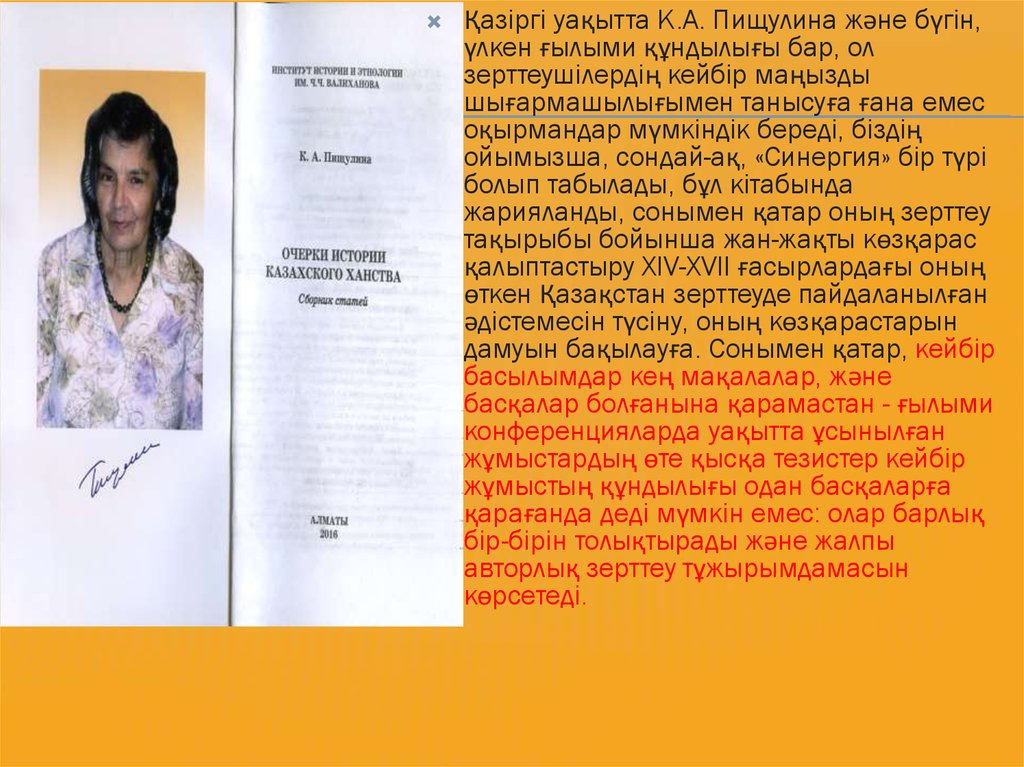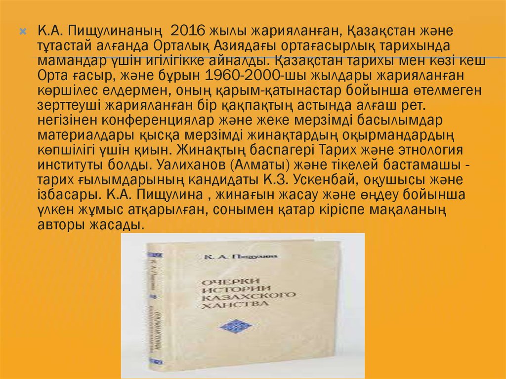 К.А. Пищулинаның 2016 жылы жарияланған, Қазақстан жәнетұтастай алғанда Орталық Азиядағы ортағасырлық тарихында