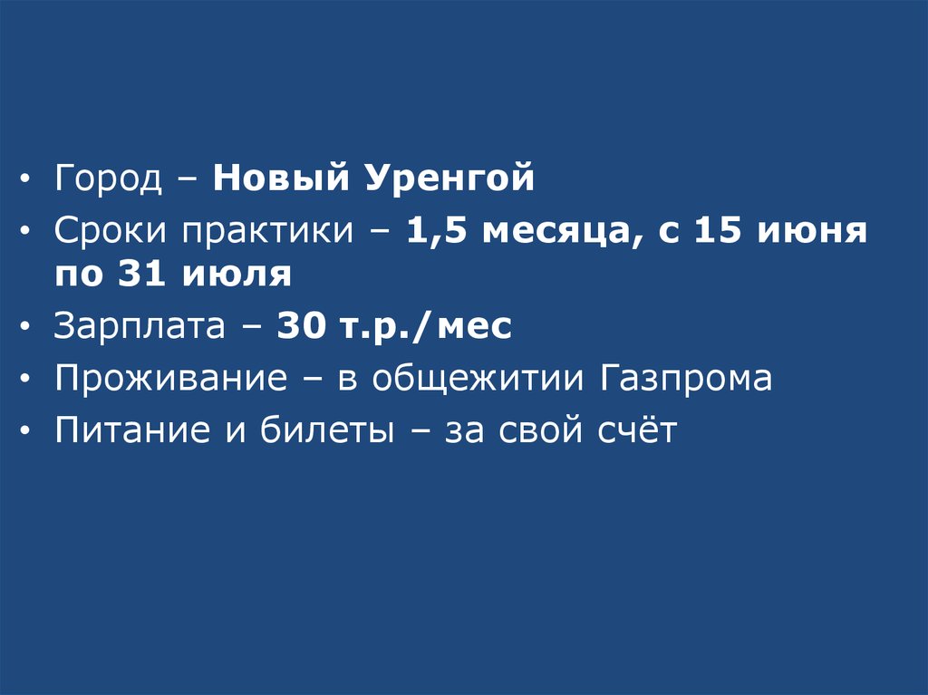 • Город – Новый Уренгой• Сроки практики – 1,5 месяца, с 15 июня