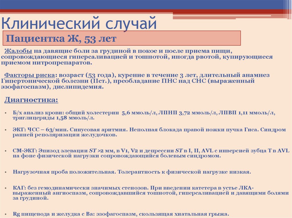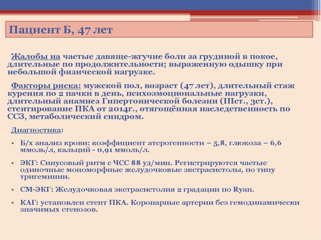Пациент Б, 47 летЖалобы на частые давяще-жгучие боли за грудиной в покое,