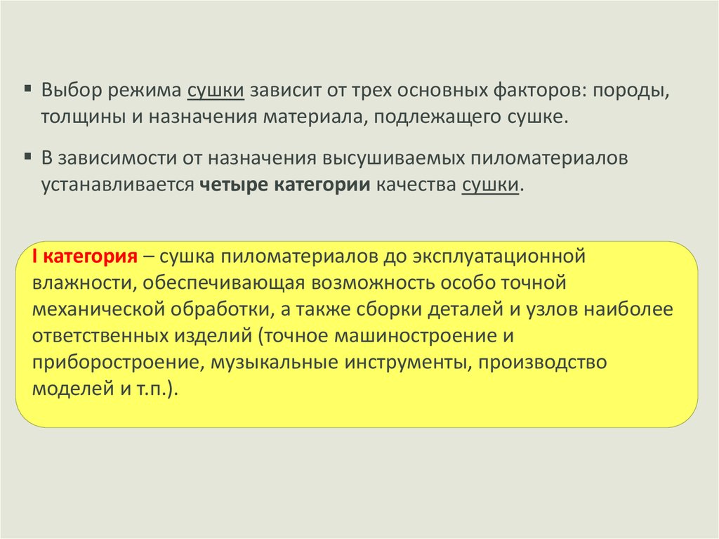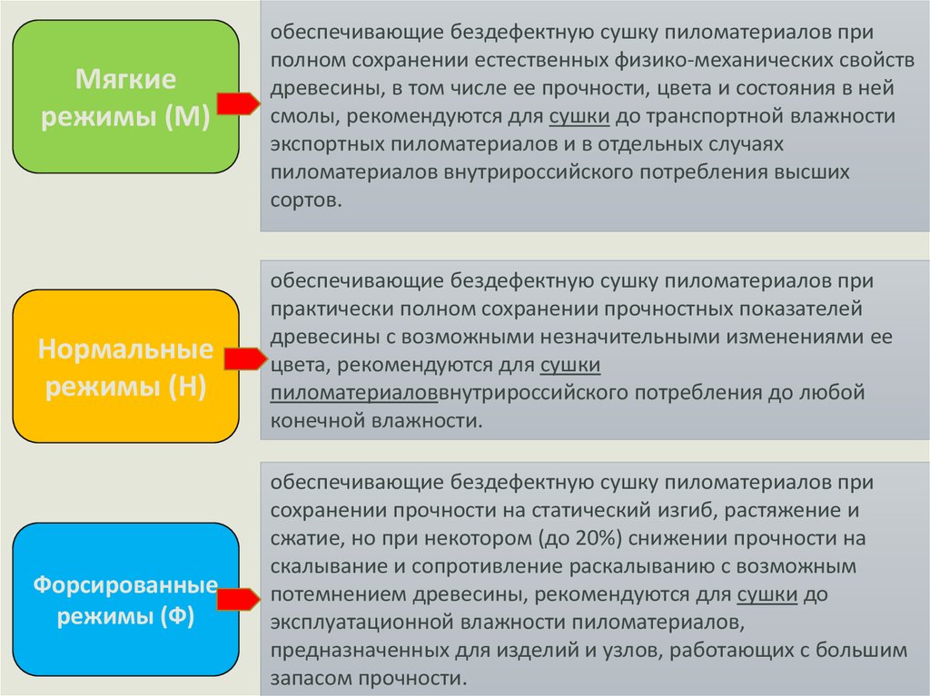 Выбор режима сушки зависит от трех основных факторов: породы,толщины и назначения материала, подлежащего сушке.