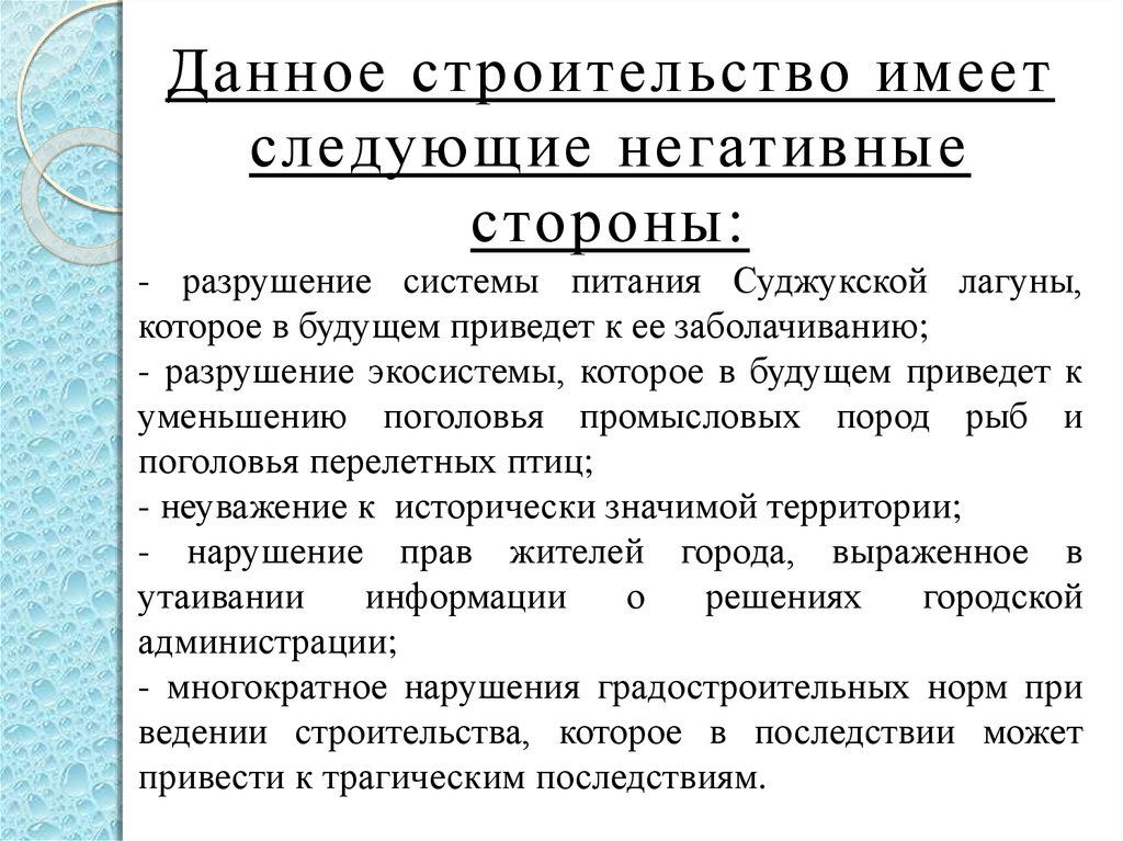 Данное строительство имеетследующие негативные