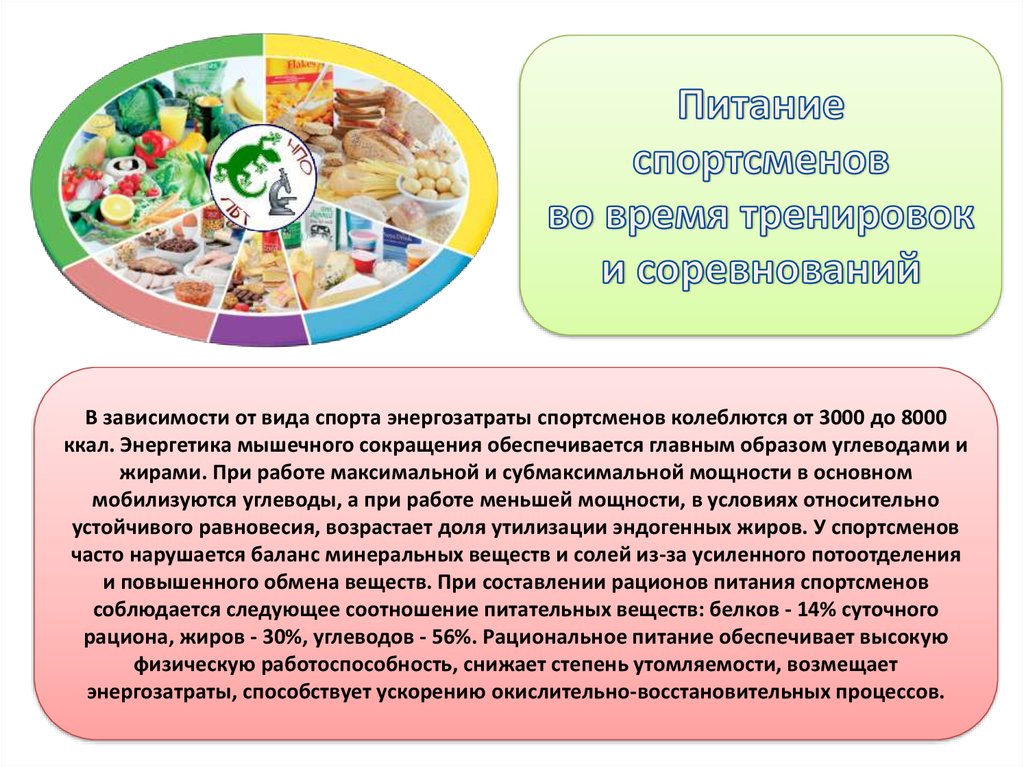 рациона, жиров - 30%, углеводов - 56%. Рациональное питание обеспечивает высокую