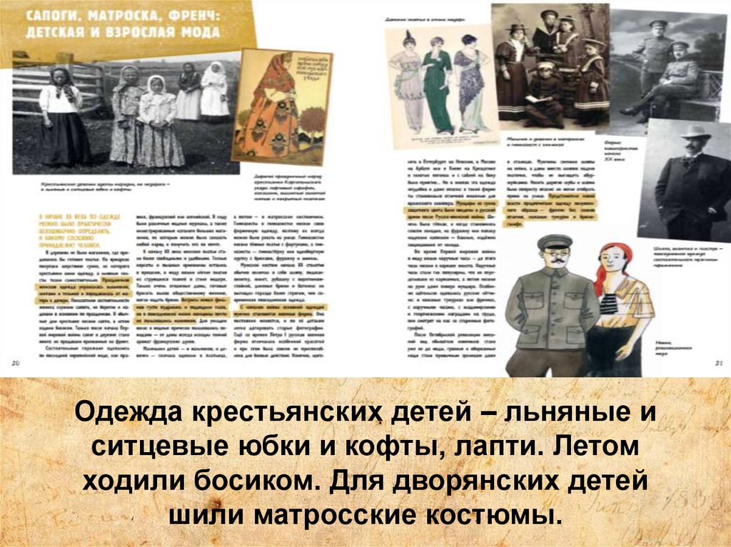 Одежда крестьянских детей – льняные иситцевые юбки и кофты, лапти. Летом