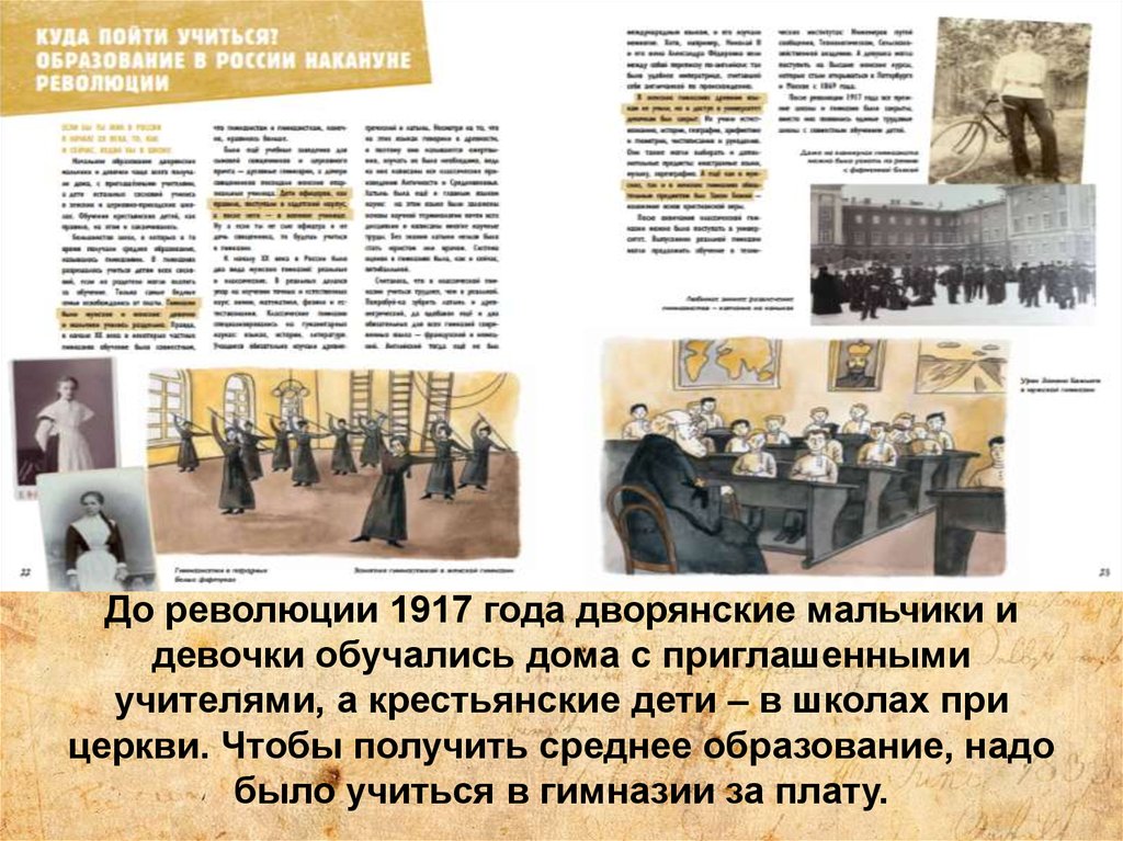 До революции 1917 года дворянские мальчики идевочки обучались дома с приглашенными