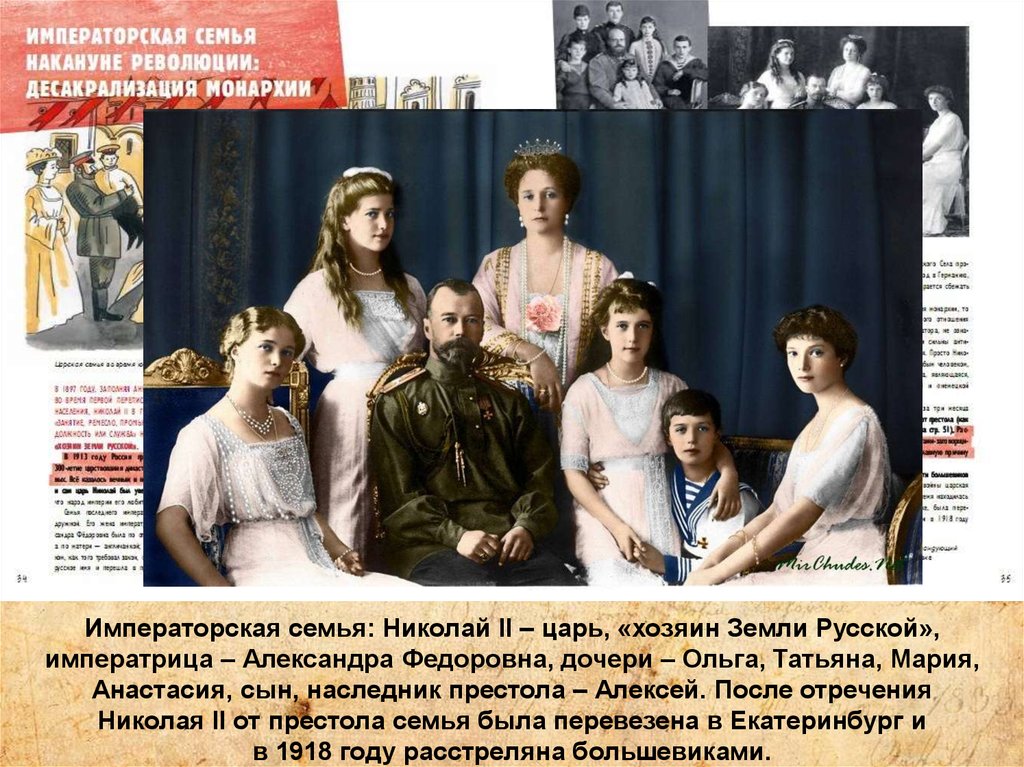 Императорская семья: Николай II – царь, «хозяин Земли Русской»,императрица – Александра Федоровна, дочери – Ольга, Татьяна, Мария,
