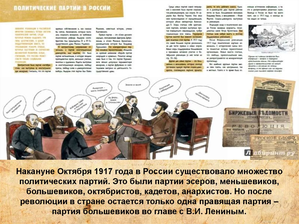 Накануне Октября 1917 года в России существовало множествополитических партий. Это были партии эсеров, меньшевиков,