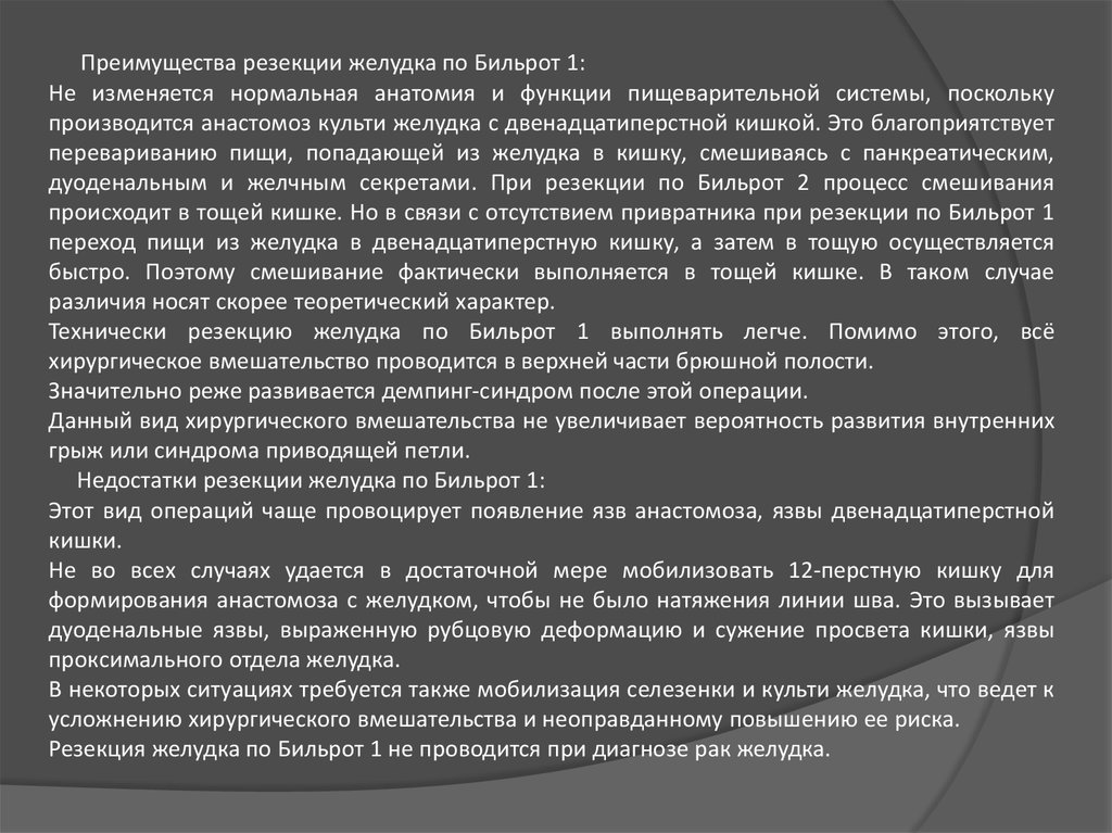 Технически резекцию желудка по Бильрот 1 выполнять легче. Помимо этого, всё