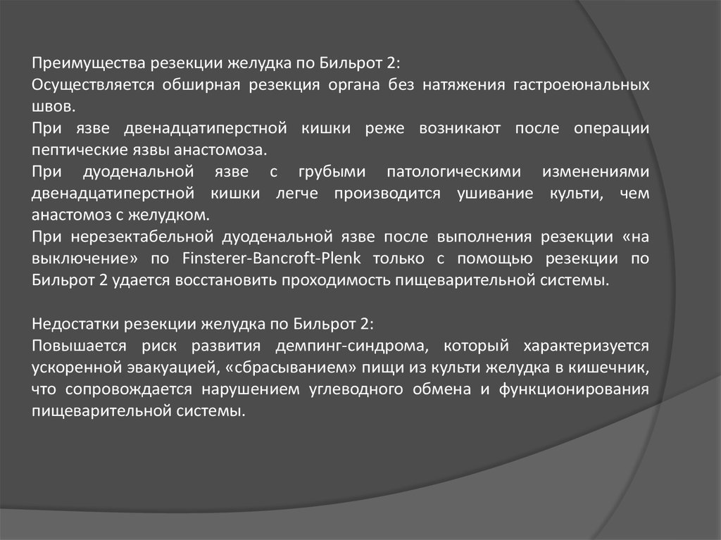 Преимущества резекции желудка по Бильрот 2:Осуществляется обширная резекция органа без натяжения гастроеюнальных