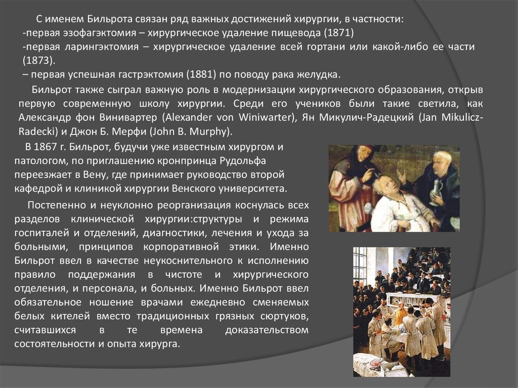 С именем Бильрота связан ряд важных достижений хирургии, в частности:-первая эзофагэктомия – хирургическое удаление пищевода (1871)