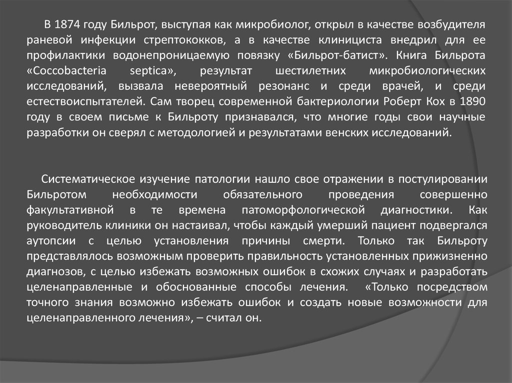 В 1874 году Бильрот, выступая как микробиолог, открыл в качестве возбудителяраневой инфекции стрептококков, а в качестве клинициста внедрил для ее