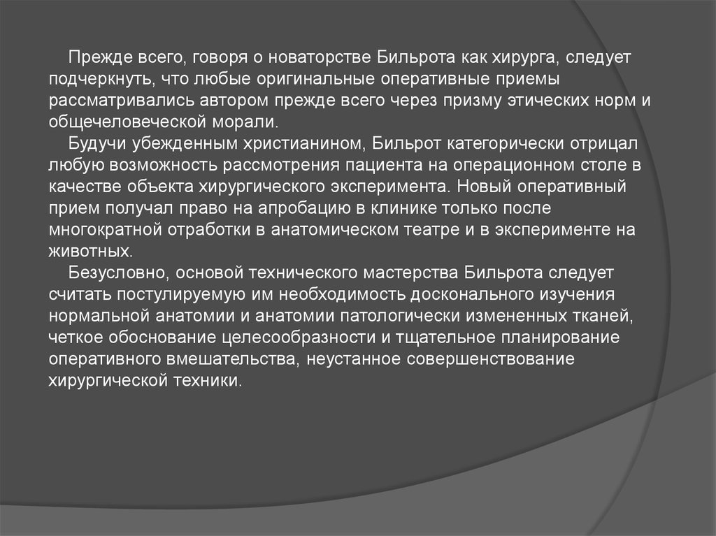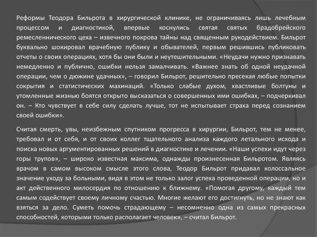 Считая смерть, увы, неизбежным спутником прогресса в хирургии, Бильрот, тем не менее,
