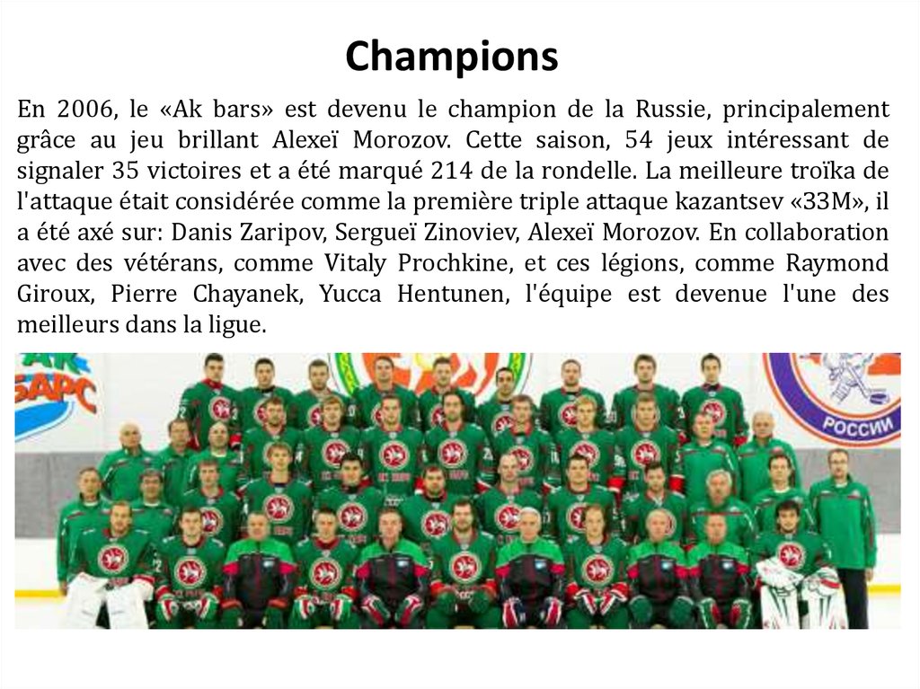 ChampionsEn 2006, le «Ak bars» est devenu le champion de la Russie, principalement