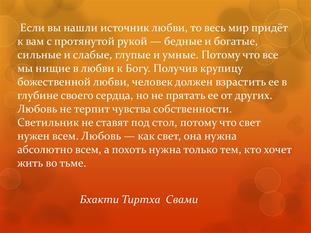 Если вы нашли источник любви, то весь мир придётк вам с протянутой рукой — бедные и богатые,