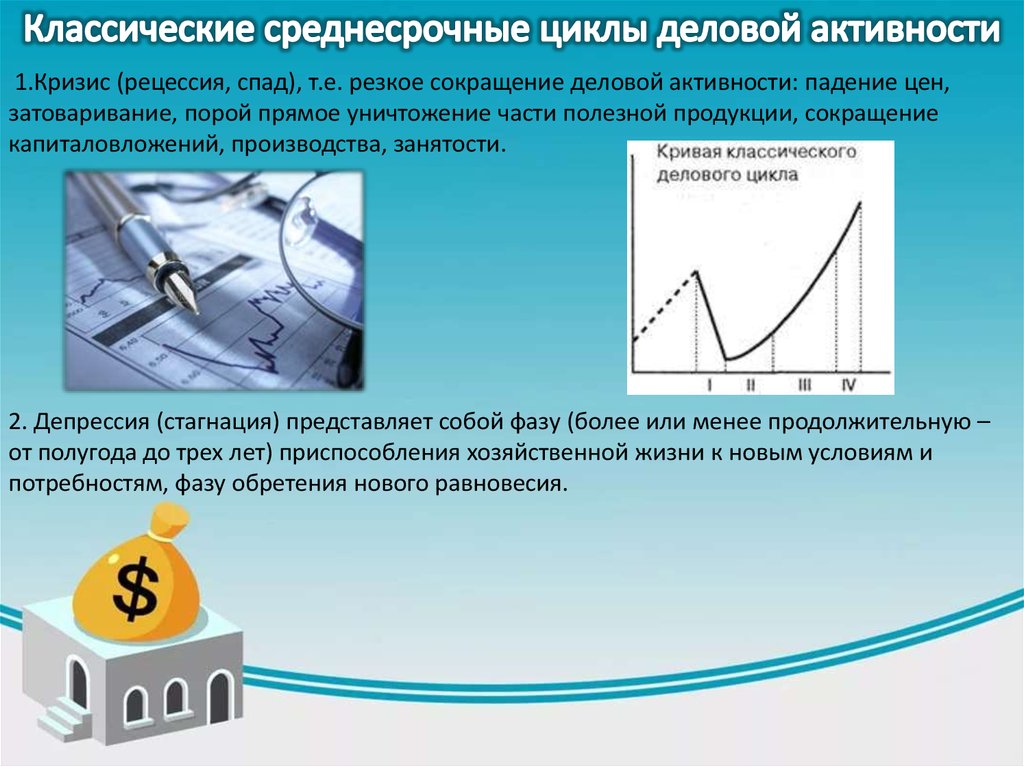 1.Кризис (рецессия, спад), т.е. резкое сокращение деловой активности: падение цен,затоваривание, порой прямое уничтожение части полезной продукции, сокращение