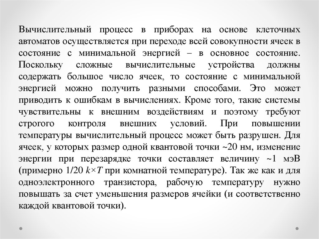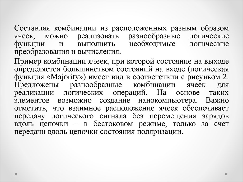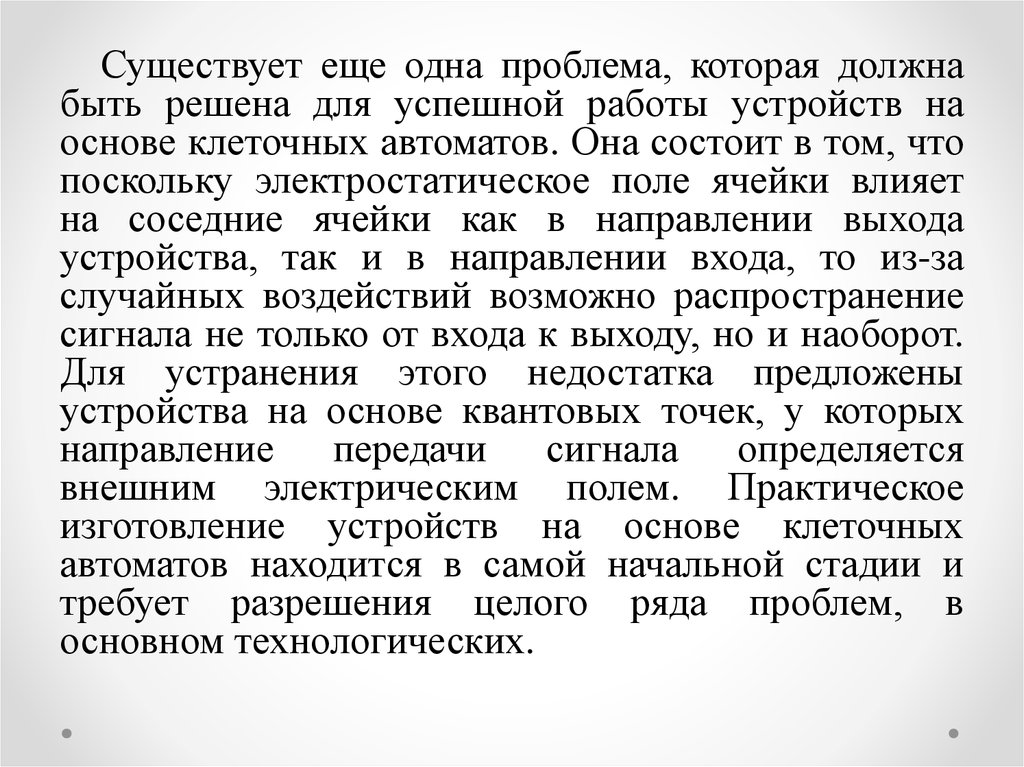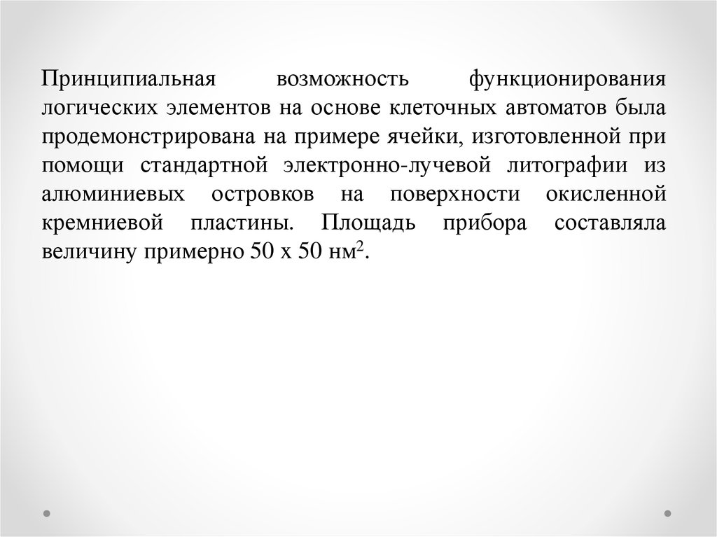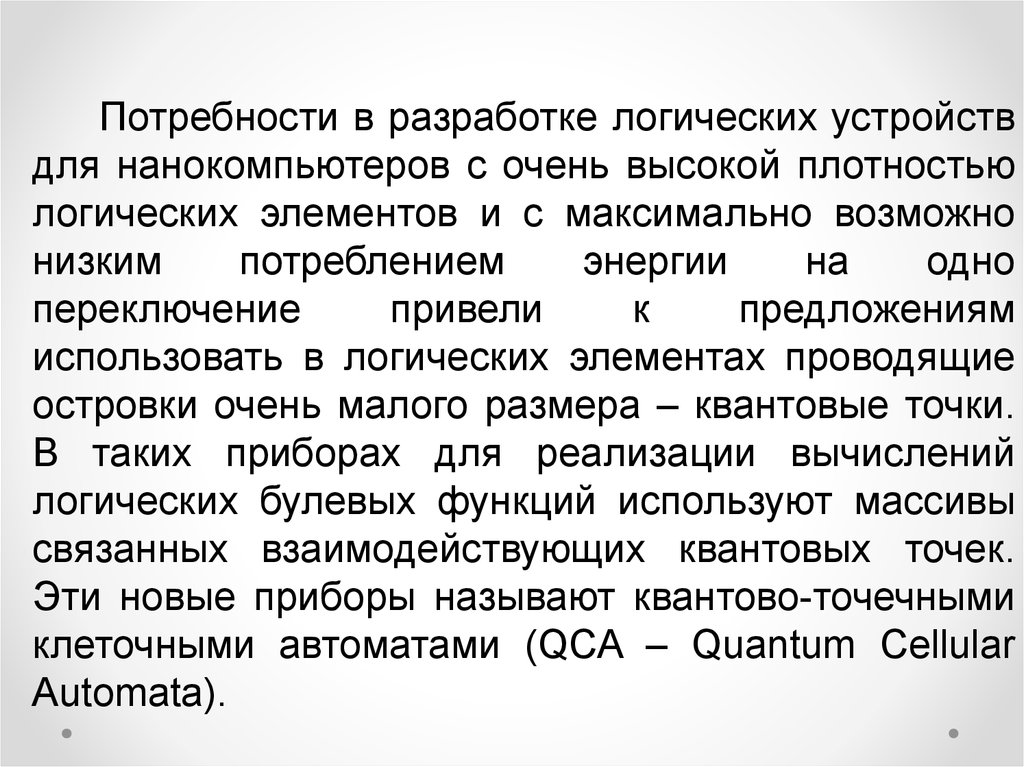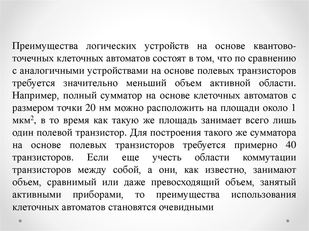 Преимущества логических устройств на основе квантовоточечных клеточных автоматов состоят в том, что по сравнениюс аналогичными устройствами на основе полевых транзисторов