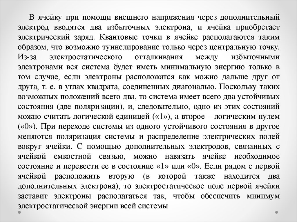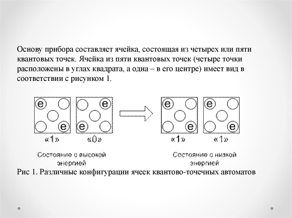 Основу прибора составляет ячейка, состоящая из четырех или пятиквантовых точек. Ячейка из пяти квантовых точек (четыре точки