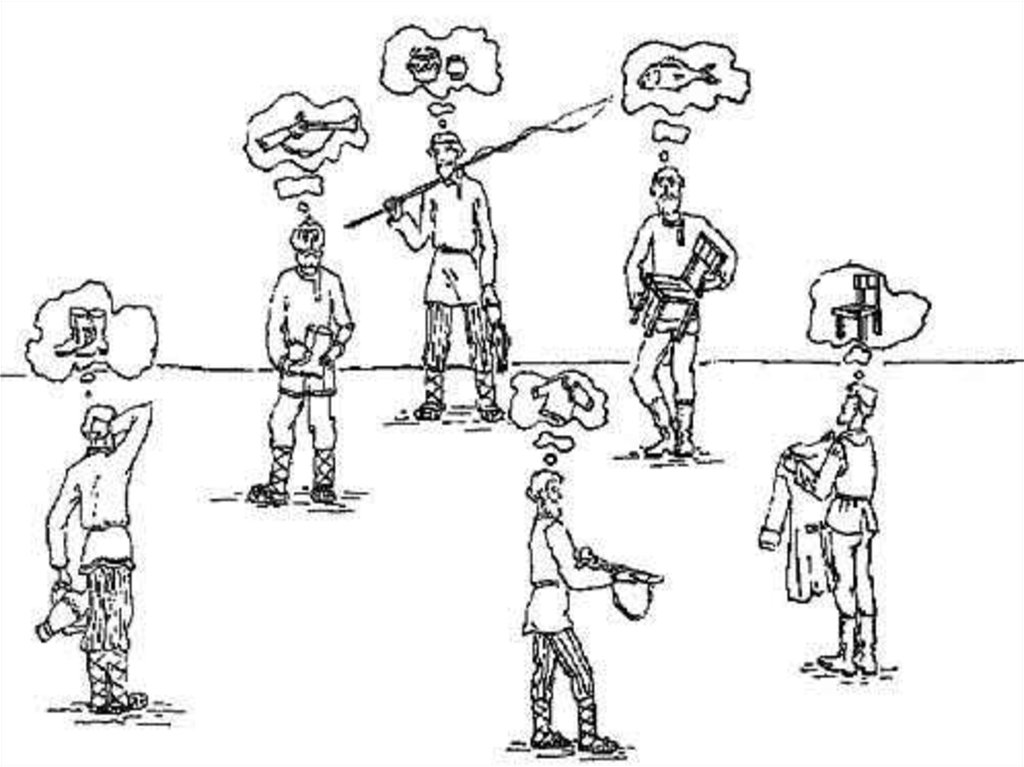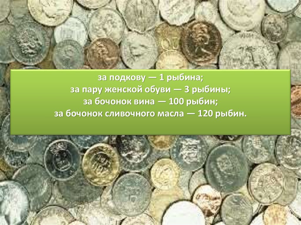 за подкову — 1 рыбина;за пару женской обуви — 3 рыбины;