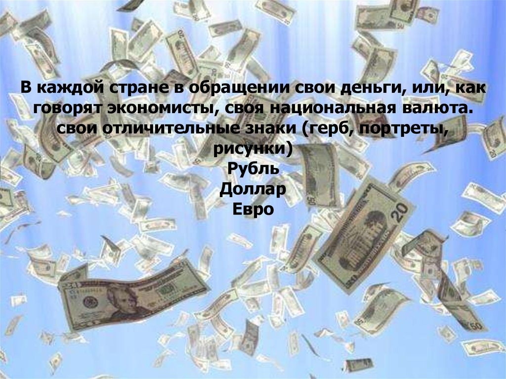 В каждой стране в обращении свои деньги, или, какговорят экономисты, своя национальная валюта.