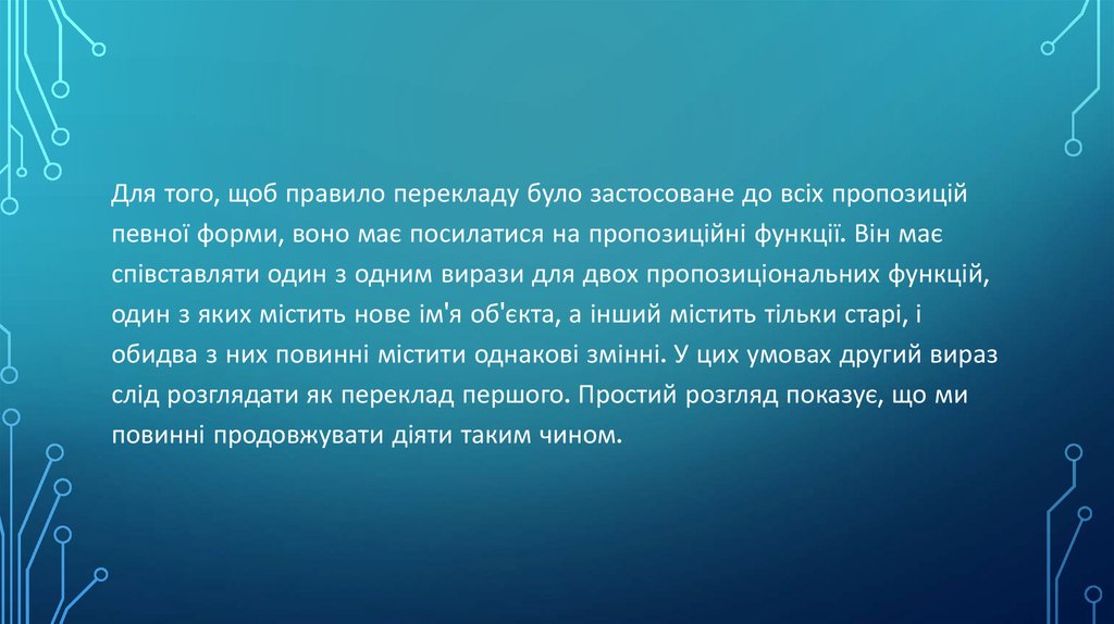 Для того, щоб правило перекладу було застосоване до всіх пропозиційпевної форми, воно має посилатися на пропозиційні функції. Він має