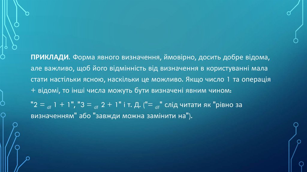 ПРИКЛАДИ. Форма явного визначення, ймовірно, досить добре відома,але важливо, щоб його відмінність від визначення в користуванні мала