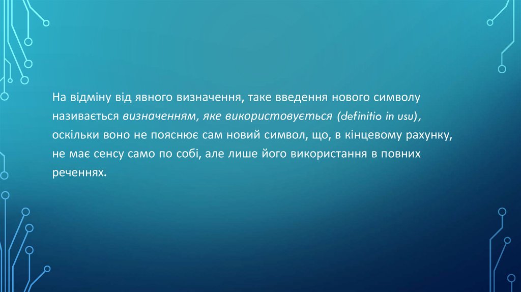 На відміну від явного визначення, таке введення нового символуназивається визначенням, яке використовується (definitio in usu),