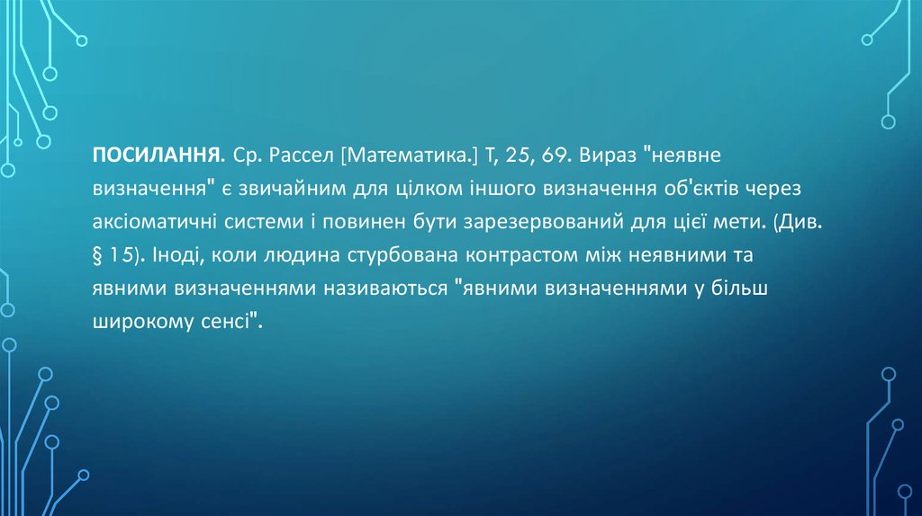 ПОСИЛАННЯ. Ср. Рассел [Математика.] T, 25, 69. Вираз "неявневизначення" є звичайним для цілком іншого визначення об'єктів через