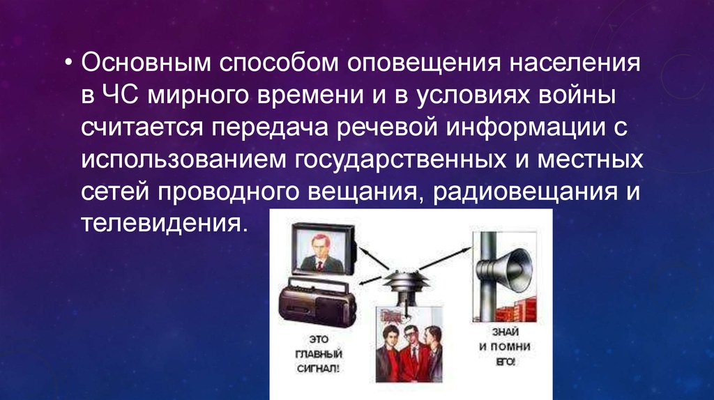 • Основным способом оповещения населенияв ЧС мирного времени и в условиях войны