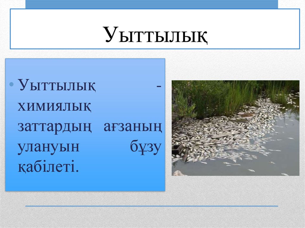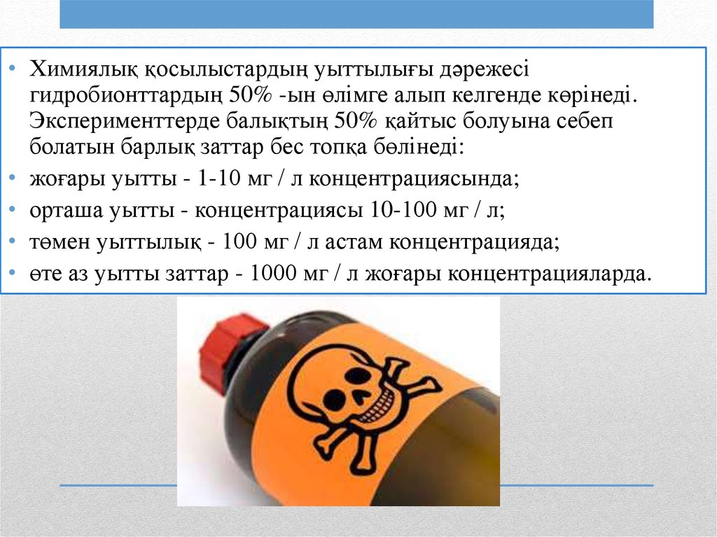 • Химиялық қосылыстардың уыттылығы дәрежесігидробионттардың 50% -ын өлімге алып келгенде көрінеді.