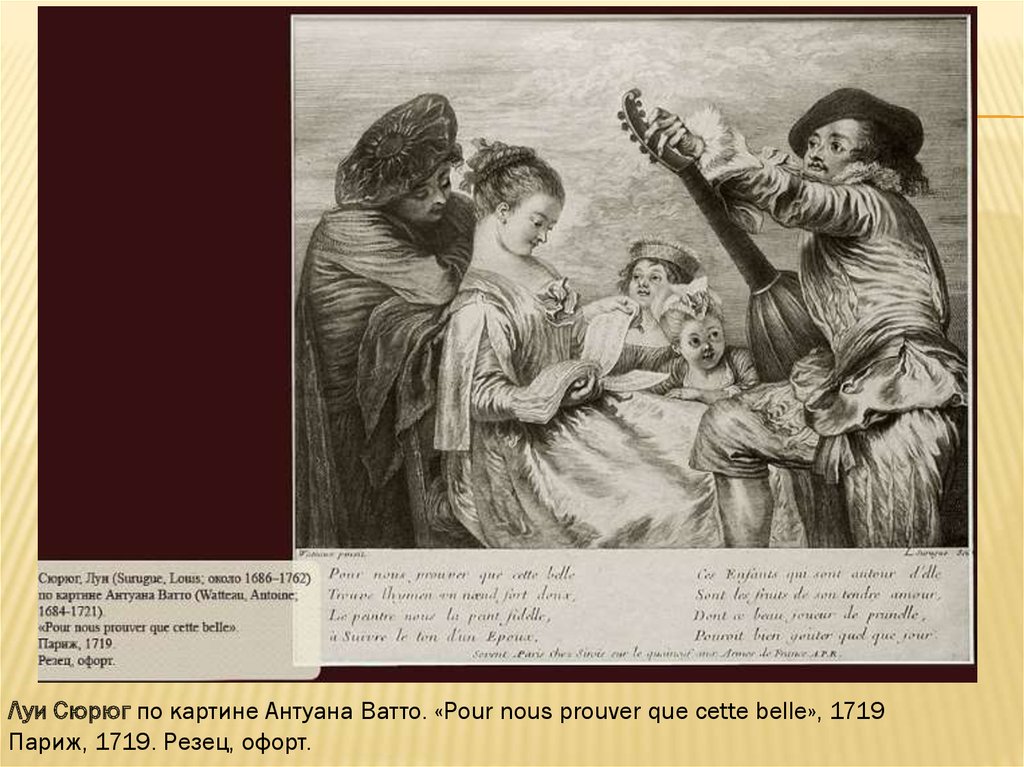 Луи Сюрюг по картине Антуана Ватто. «Pour nous prouver que cette belle», 1719Париж, 1719. Резец, офорт.
