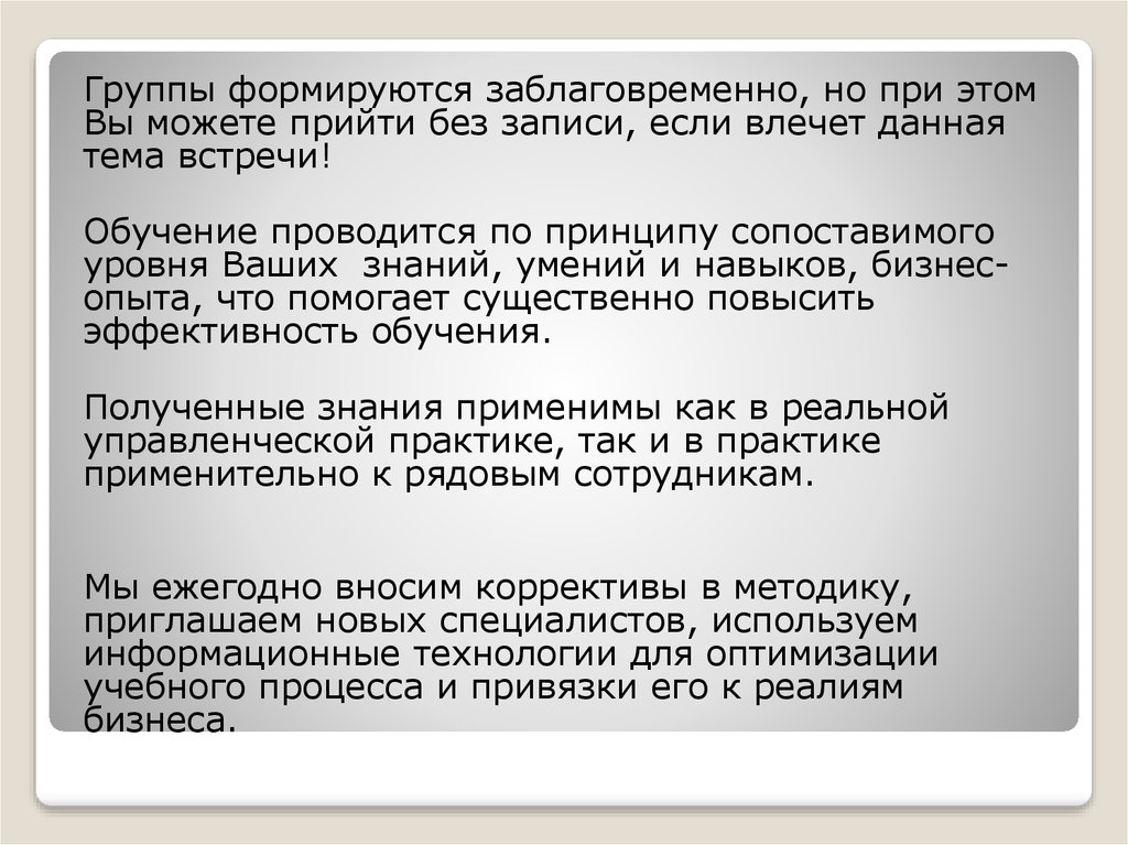 Группы формируются заблаговременно, но при этомВы можете прийти без записи, если влечет данная