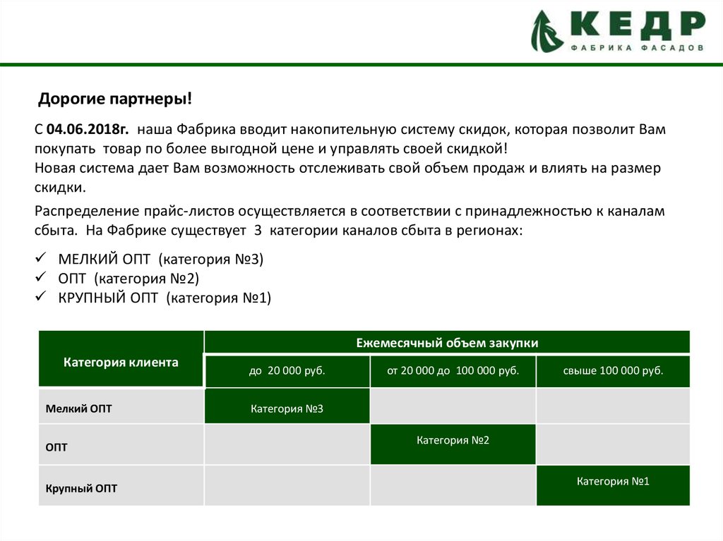 Дорогие партнеры!С 04.06.2018г. наша Фабрика вводит накопительную систему скидок, которая позволит Вам