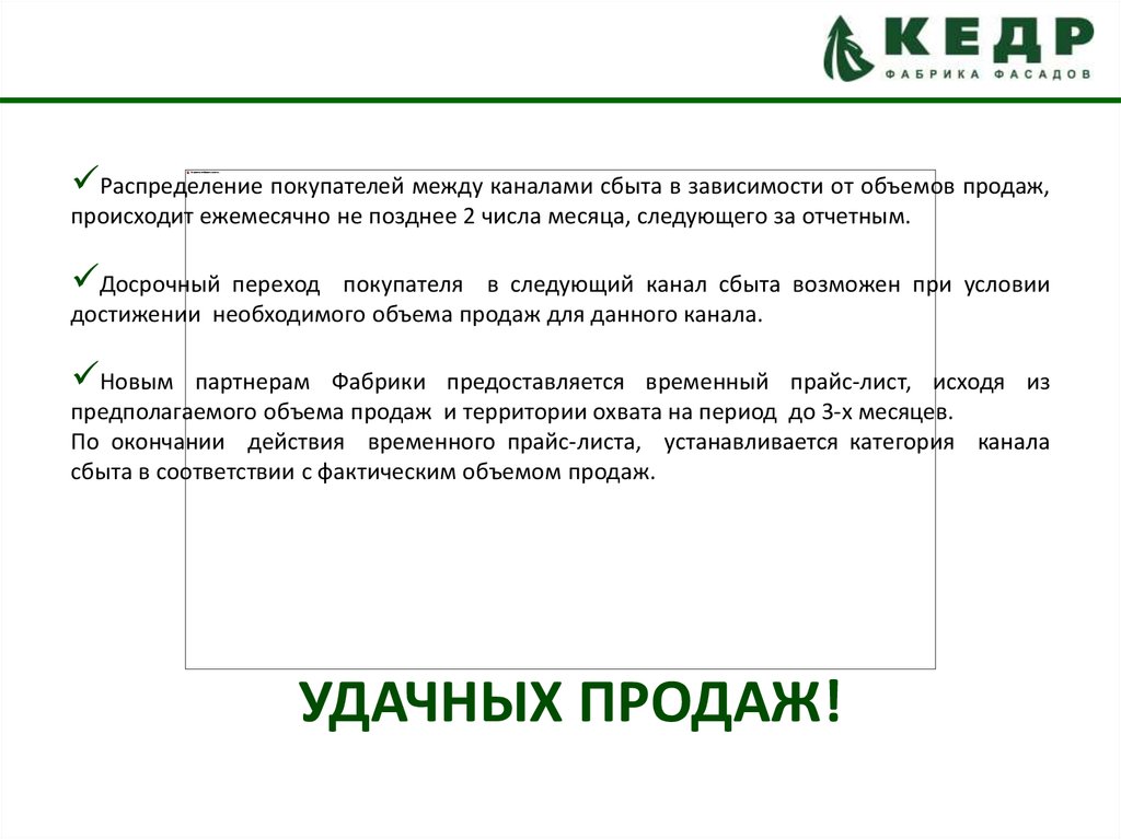Распределение покупателей между каналами сбыта в зависимости от объемов продаж,происходит ежемесячно не позднее 2 числа месяца, следующего за отчетным.