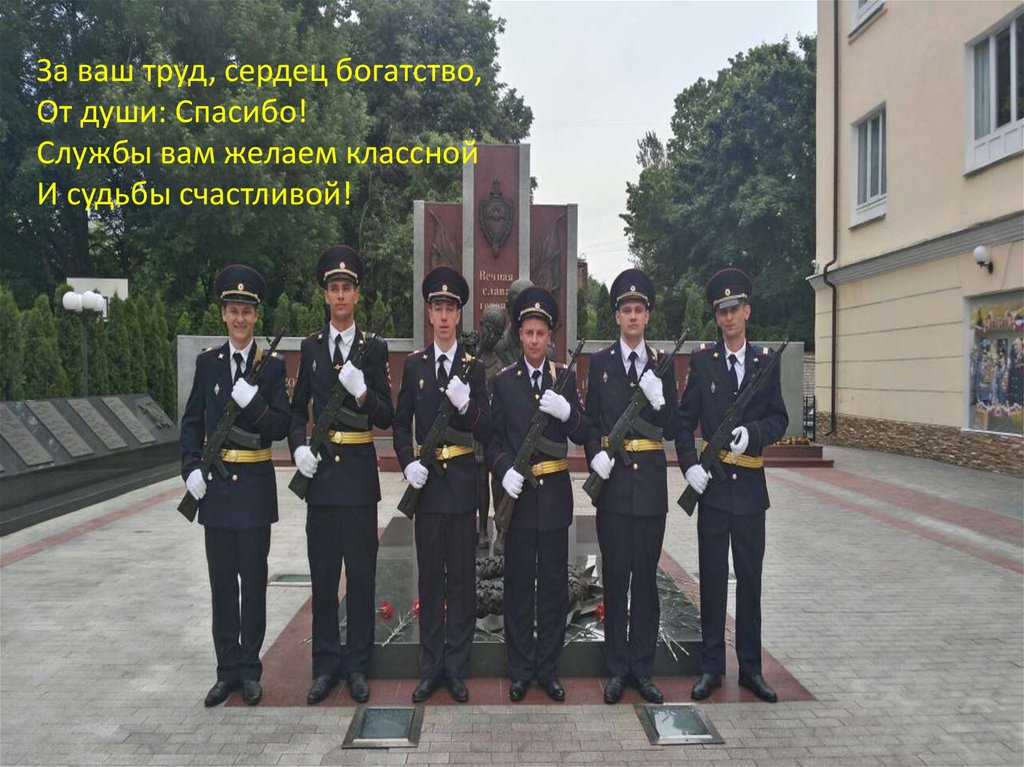 7. Пусть радости мгновения, Умножатся раз в сто! Пусть будет жизнь отличною, А служба – просто клад,