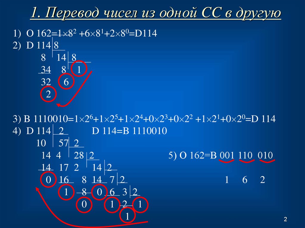 1. Перевод чисел из одной CC в другую1) O 162=1 82 +6 81+2 80=D114