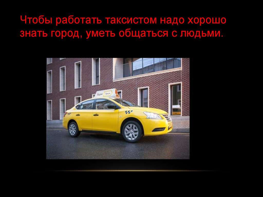 Чтобы работать таксистом надо хорошознать город, уметь общаться с людьми.