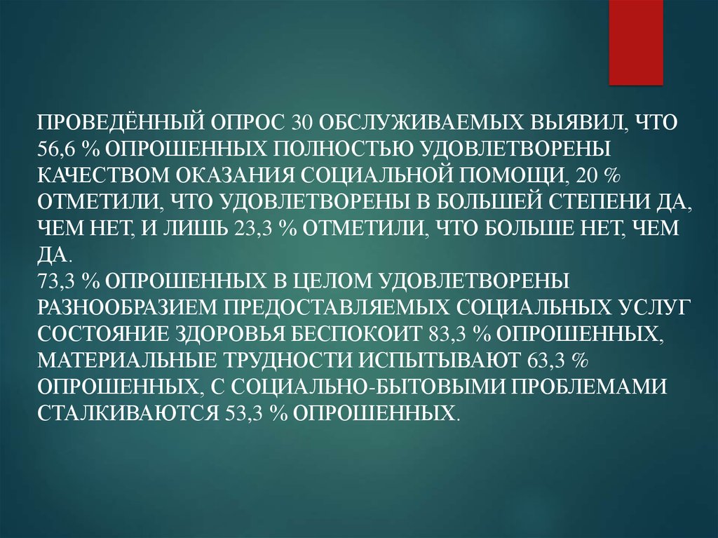 ПРОВЕДЁННЫЙ ОПРОС 30 ОБСЛУЖИВАЕМЫХ ВЫЯВИЛ, ЧТО56,6 % ОПРОШЕННЫХ ПОЛНОСТЬЮ УДОВЛЕТВОРЕНЫ