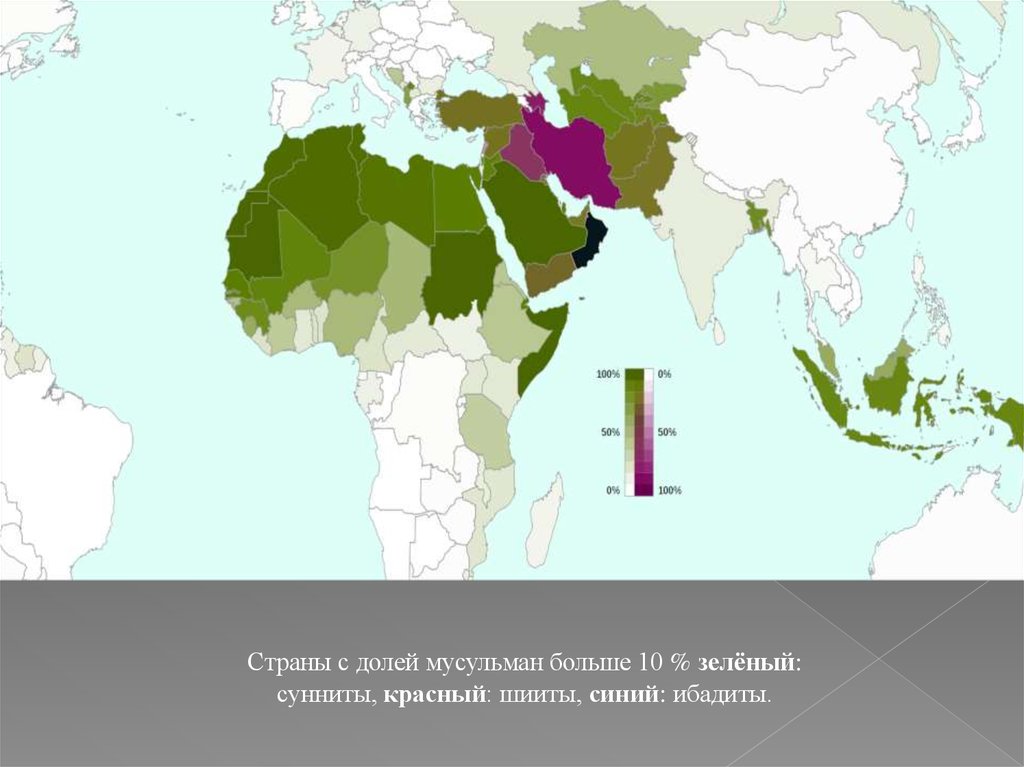 Страны с долей мусульман больше 10 % зелёный:сунниты, красный: шииты, синий: ибадиты.