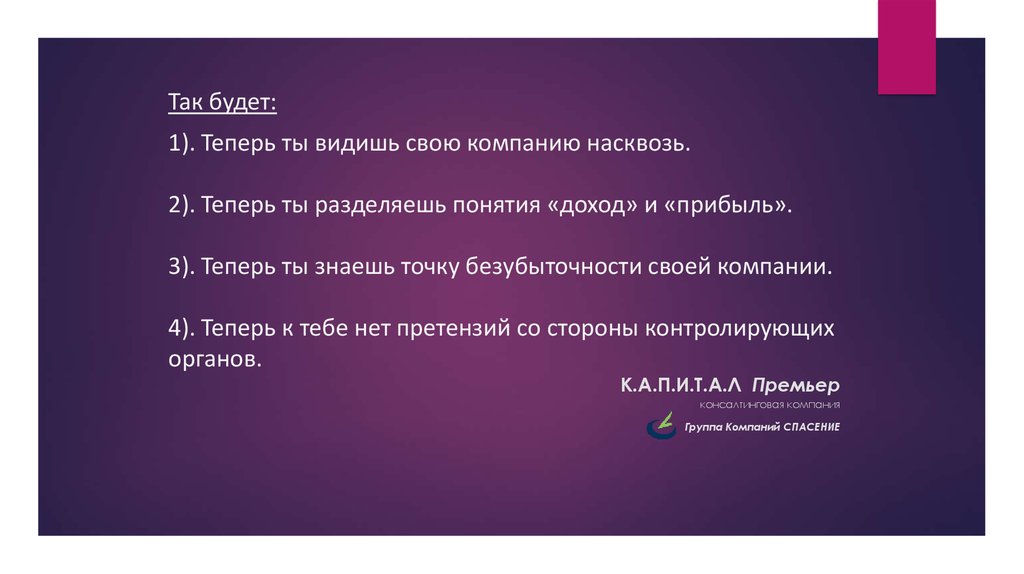 Так будет:1). Теперь ты видишь свою компанию насквозь.