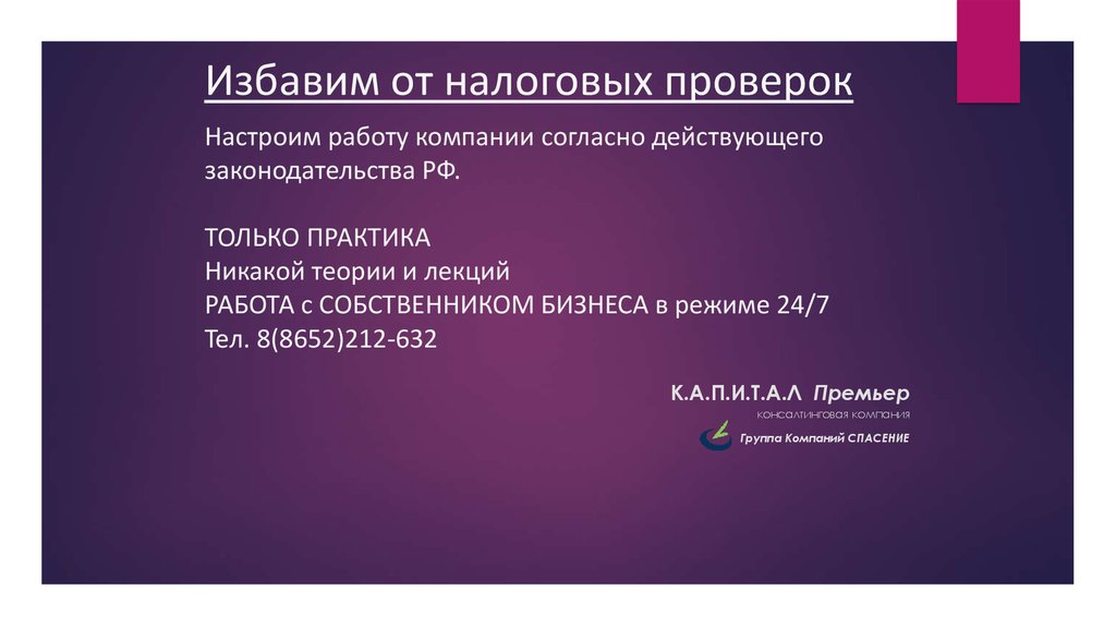 Избавим от налоговых проверокНастроим работу компании согласно действующего