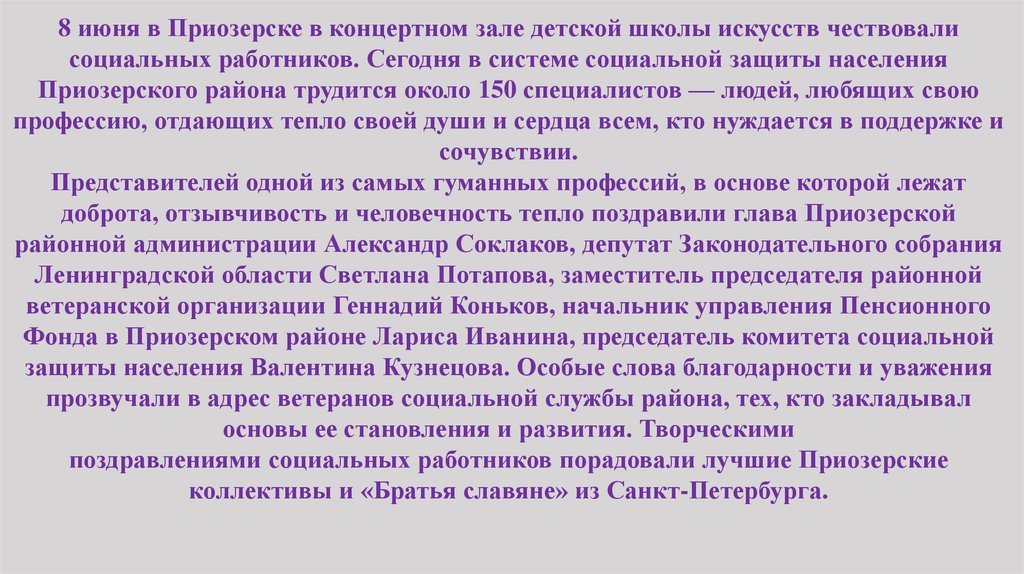 8 июня в Приозерске в концертном зале детской школы искусств чествовалисоциальных работников. Сегодня в системе социальной защиты населения