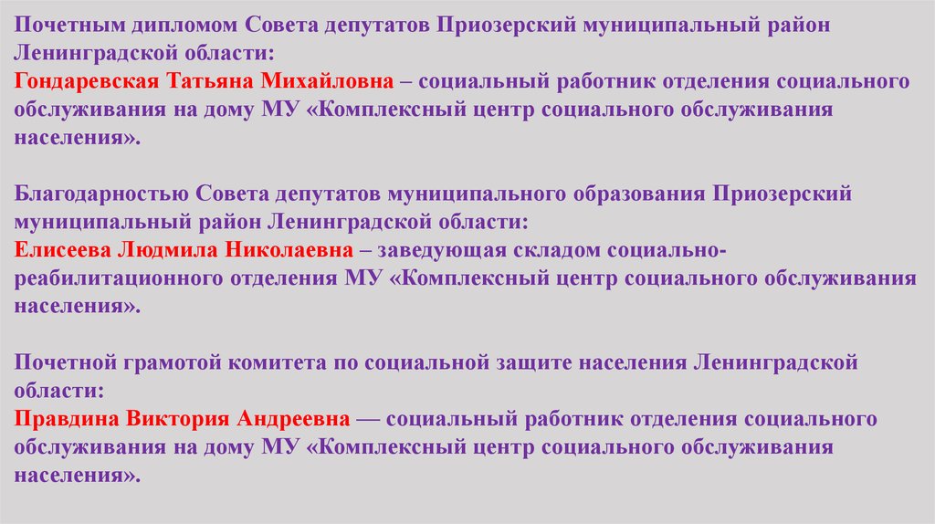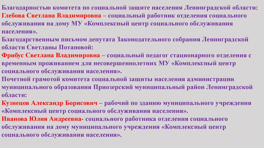 Благодарностью комитета по социальной защите населения Ленинградской области:Глебова Светлана Владимировна – социальный работник отделения социального