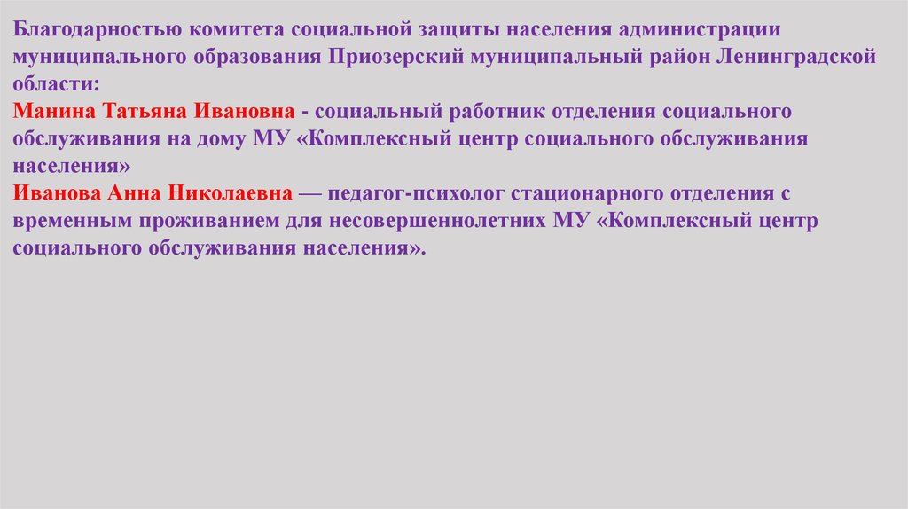 Благодарностью комитета социальной защиты населения администрациимуниципального образования Приозерский муниципальный район Ленинградской