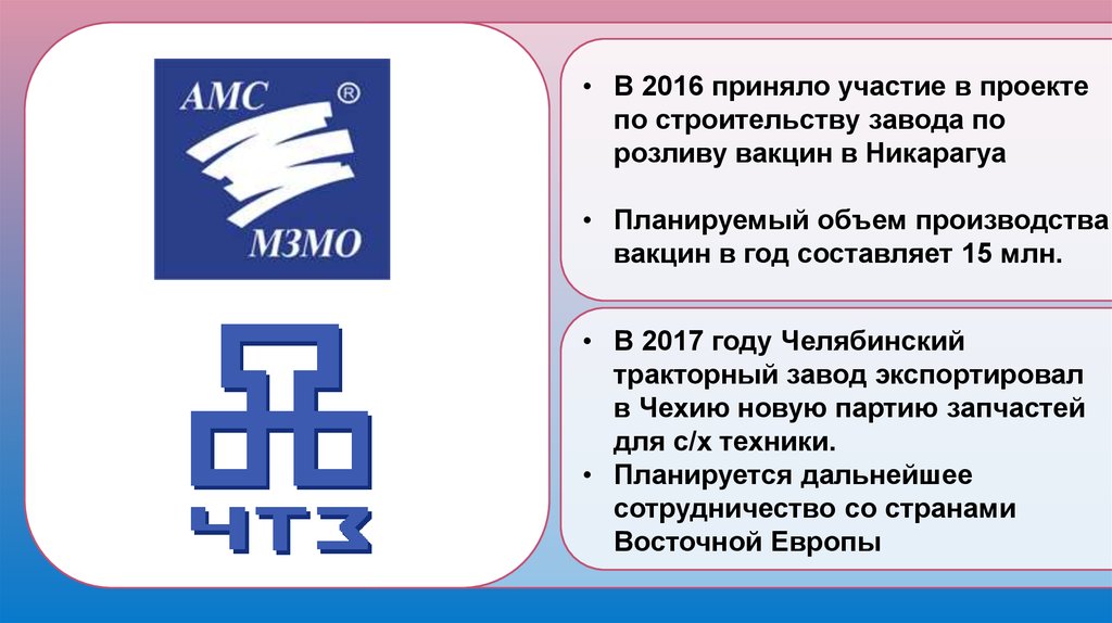 • В 2016 приняло участие в проектепо строительству завода по
