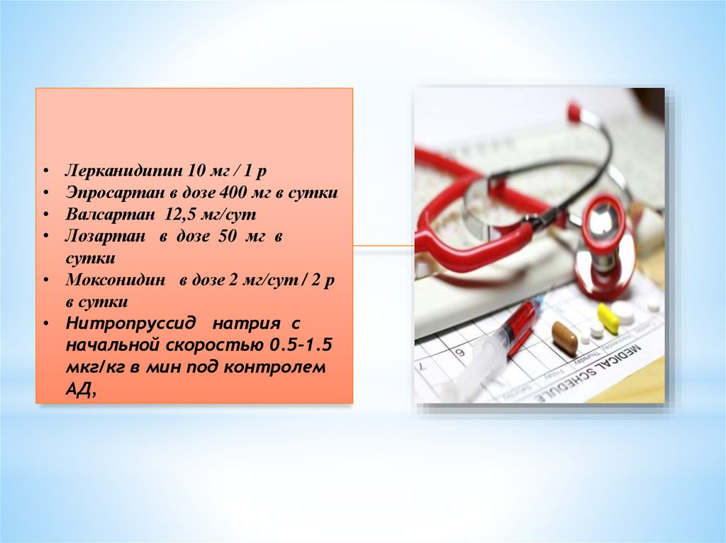 • Моксонидин в дозе 2 мг/сут / 2 р