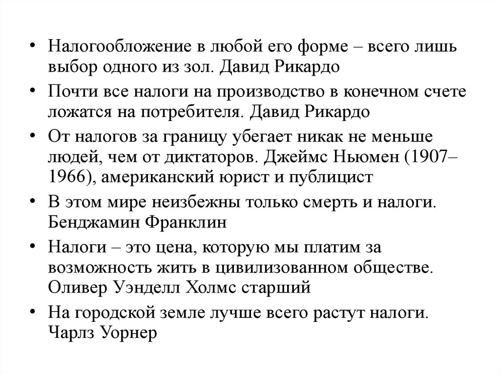 • Налогообложение в любой его форме – всего лишьвыбор одного из зол. Давид Рикардо