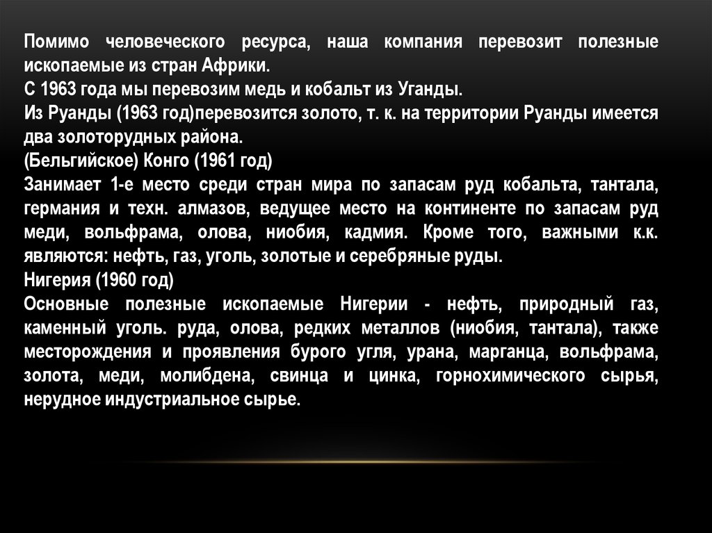 Помимо человеческого ресурса, наша компания перевозит полезныеископаемые из стран Африки.