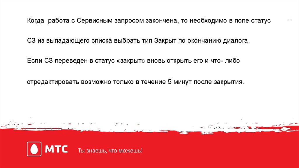 Когда работа с Сервисным запросом закончена, то необходимо в поле статусСЗ из выпадающего списка выбрать тип Закрыт по окончанию диалога.